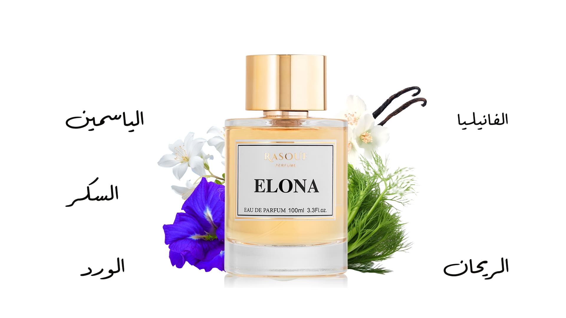 • مكوّنات العطر: الياسمين، الفانيليا، الريحان، الورد الأبيض، السكر